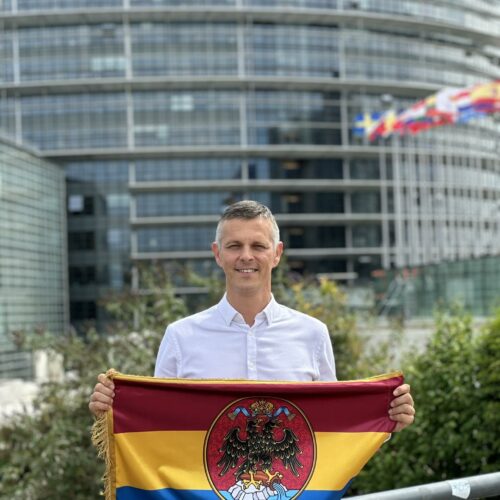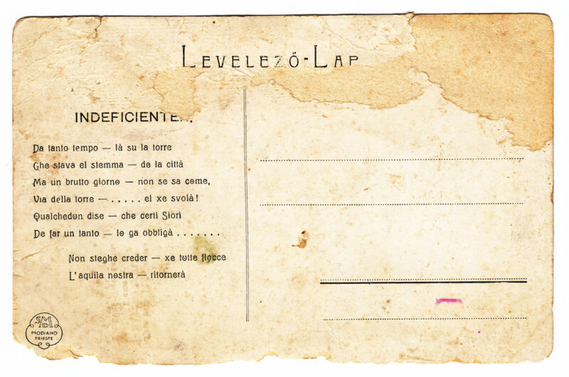 „II governatore regio di Fiume e nel Litorale ungarico-croato No. 209 Al Magistrato Civico In Fiume. In evasione del rapporto dd. 4. settembre a. c. No. 2088 trovo di concedere. che d’ora innamzi venga adottato qual gonfalone del municipio di Fiume que U che verme stabilito dall’inclita Congregazione municipale ed ii di cui disegno viene qui acchiuso, cioe i tre colori desunti dallo stemma originario: ii carmino, ii giallo dorato ed ultramare disposti orizzontalmente con in mezzo Vaquila bicipite fiumana fiancheggiata dai patroni della citta S.S. Vito e Modesto; osservo pero che in occasioni solenni deve venire contemporaneamente al gonfalone del municipio inalberata anche la bandiera tricolore unghrese.