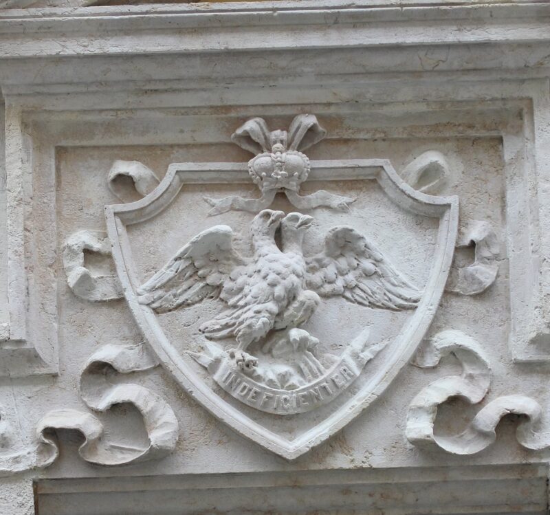 mezzo l’aquila bicipite, fiancheggiata dai patroni della città S.S. Vito e Modesto.