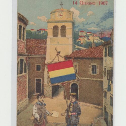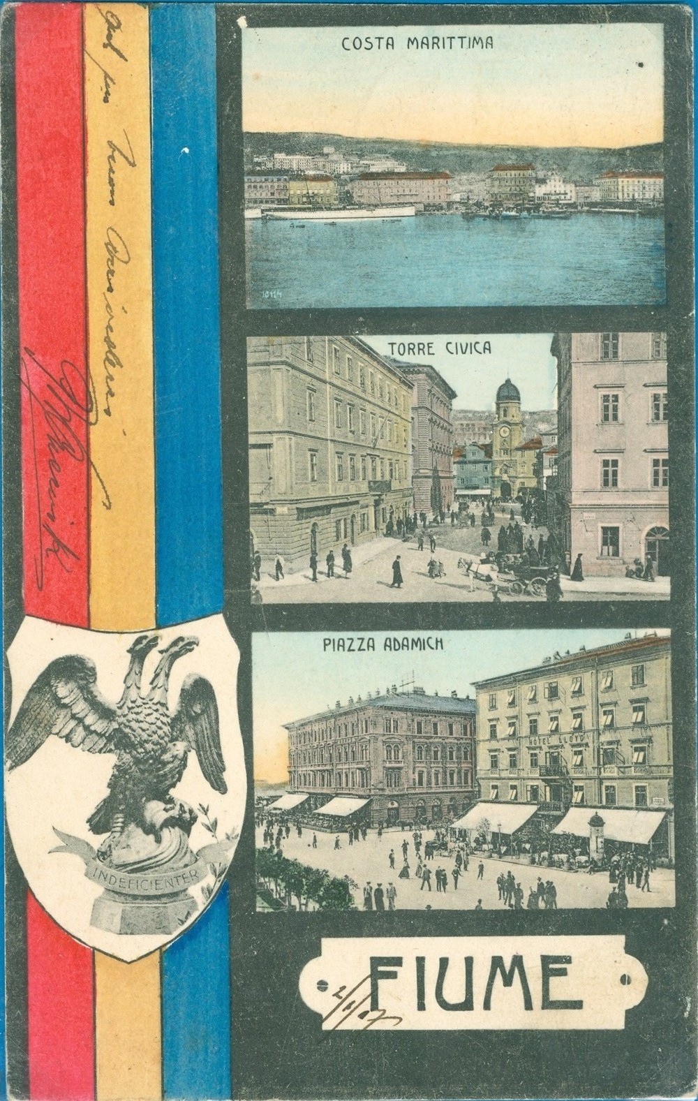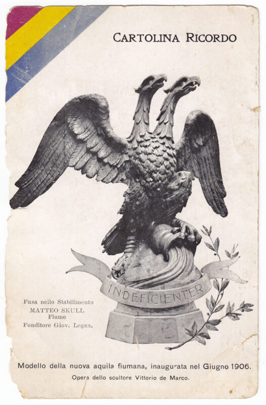1906. Originalna razglednica iz 1906. godine u povodu postavljanja skulpture dvoglavog orla na kupolu riječkog Gradskog tornja od strane riječkih žena.