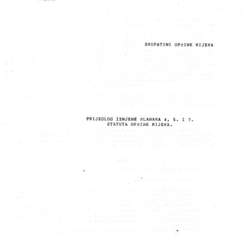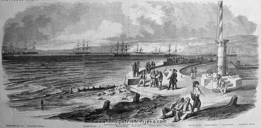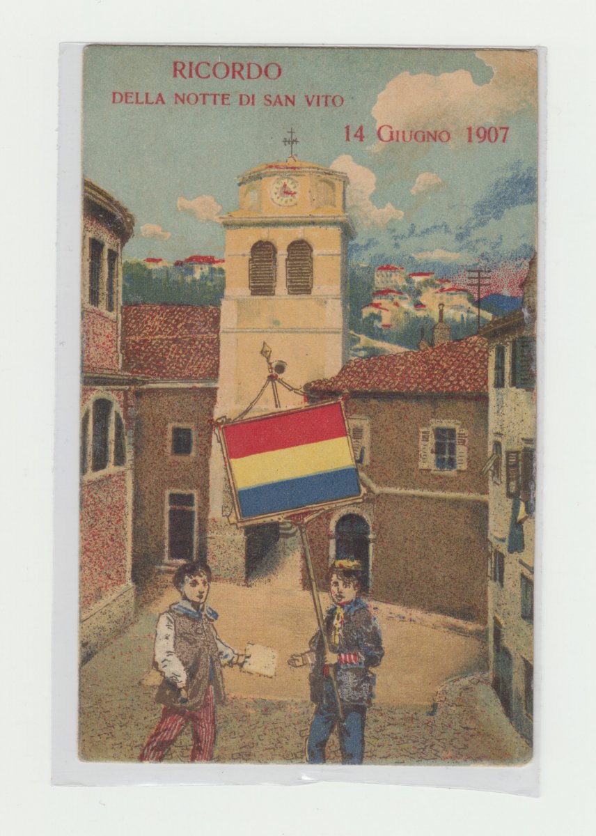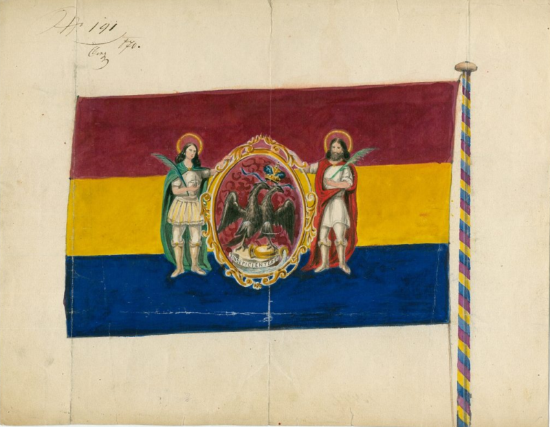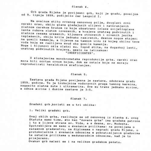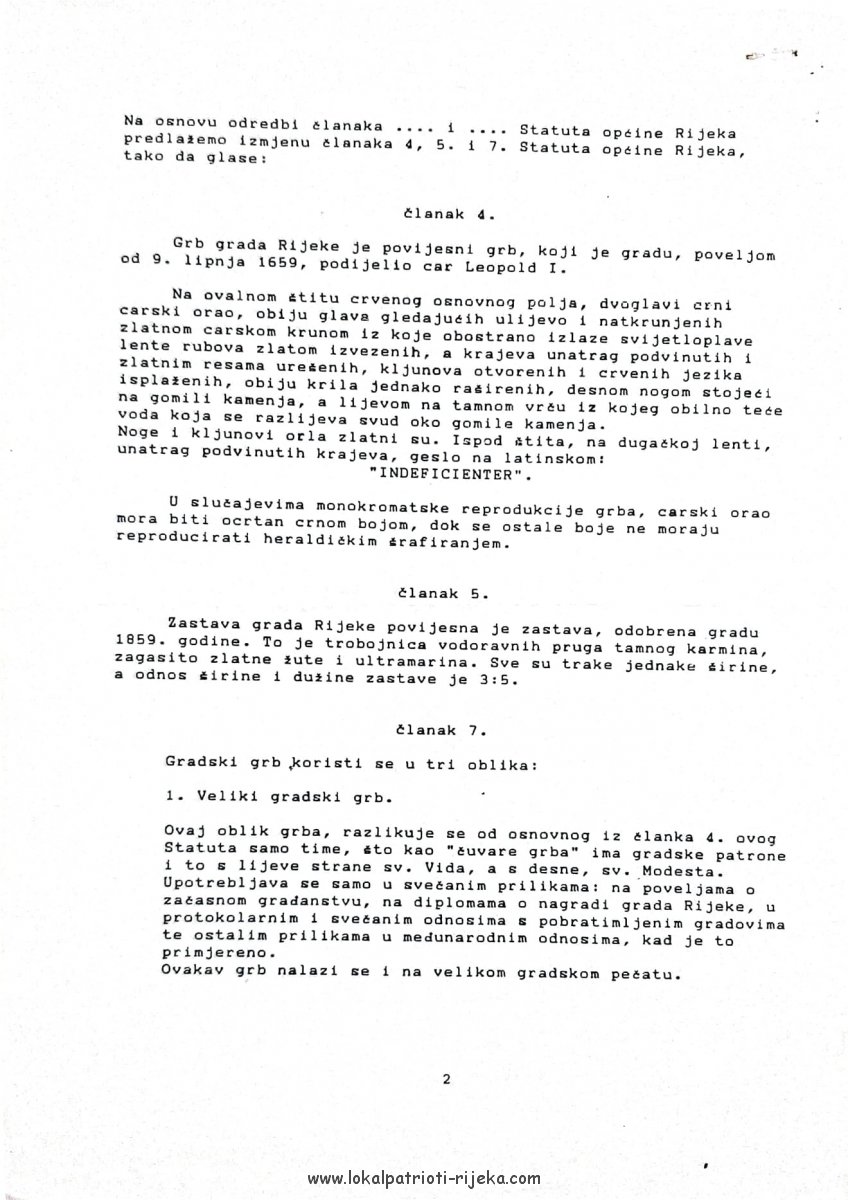 La rappresentanza di Fiume aveva chiesto ed ottenuto da S. Maesta’ il diritto di usare d’una propria bandiera secondo i colori proposti, i quali furono il rosso ed il bianco, disposti secondo la bandiera maritima, coi Santi Vito e Modesto. In appresso tanto il municipio quanto i privati spiegarono la bandiera tricolore la quale va spiegata in ogni incontro di solenità, rimando però anche la primitiva bianco rossa all’asta nella piazza del civico edifizio, onde appare il municipio di Fiume di due bandiere – ne segue da cio’ la naturale proposizione voglia l’Inclita congregazione stabilire a suo distintivo una sola bandiera coi tre colori di gia prescelti ed adottati nonchè desunti dallo stemma municipale, issati nei tempi antichi, cioè il carmino, il giallo dorato e l’oltre mare, disposti orizzontalmente, apponendovi nella metà del campo dell’asta in luogo dei santi, il gallo, il quale, come amblema di Fiume, figura nei civici uffici e sugelli.