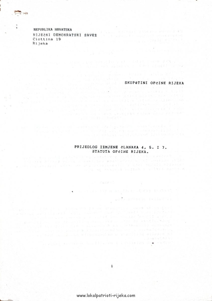 Predstavnici ( rapresentanza) Rijeke su zatražili i dobili od Njegovog Visočanstva pravo na korištenje jedne vlastite zastave prema predloženim bojama, koje su bile crveno i bijelo, izloženi (disposti) prema pomorskoj zastavi, sa Sv. Vitom i Modestom. Nadalje, kako grad tako i privatne osobe izlagali su (spiegarono) trobojnu zastavu koje se izlagala u svakom svečanom trenutku, ali zadržavajući pri tom staru crveno-bijelu zastavu na stijegu na trgu Gradske palače, gdje se nalazi Municipij ( gradska uprava) Rijeke, (na taj način ) izlažući dvije zastave- stoga slijedi prirodan prijedlog da Slavno gradsko vijeće uspostavi svojom voljom jednu zastavu s tri boje, već ranije odabrane i prihvaćene, odnosno preuzete iz gradskog grba, dobivenog u starog doba, tj. Karmin, zlatno žuta i ultramarin (oltre mare), položene vodoravno , postavljajući u sredinu, na mjestu svetaca, žutu boju , koja se kao amblem Rijeke, nalazi u gradskim uredima i na pečatima.