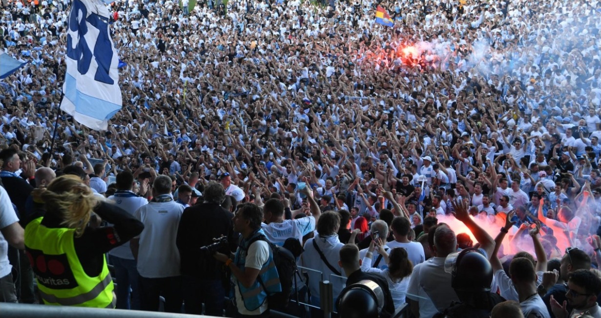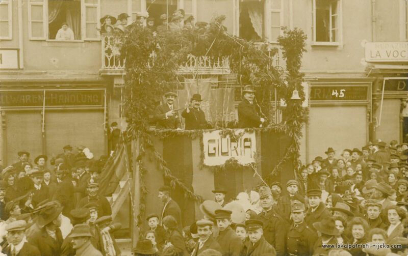 Riječki karneval – Alegorijska kola Giuria – ili ti ga žiri ukrašen riječkim gradskim trobojnicama. Ispod 2 gradska pandura s riječkim gradskim obilježjima na glavi.