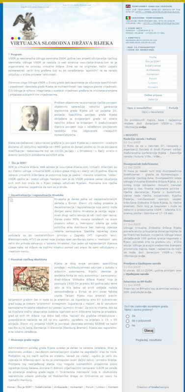 12.11.2004. Osnovana udruga “Slobodna Država Rijeka-Stato Libero di Fiume”, na dan kad je 1920. godine, Rijeka proglašena državom. To je prva udruga u Rijeci koja je počela promovirat riječki identitet i koja je učinila jako mnogo po tom pitanju. Prilikom osnivanja, hrvatske vlasti bile su skeptične i nisu dopuštale ime “Slobodna država Rijeka” koje danas nosi. Iz tog razloga odabran je naziv “Virtualna Slobodna Država Rijeka-Stato Libero di Fiume”. Iako neki od osnivača kažu da su bili susretljivi iz uprave. No bilo je tad i usijanih glava.