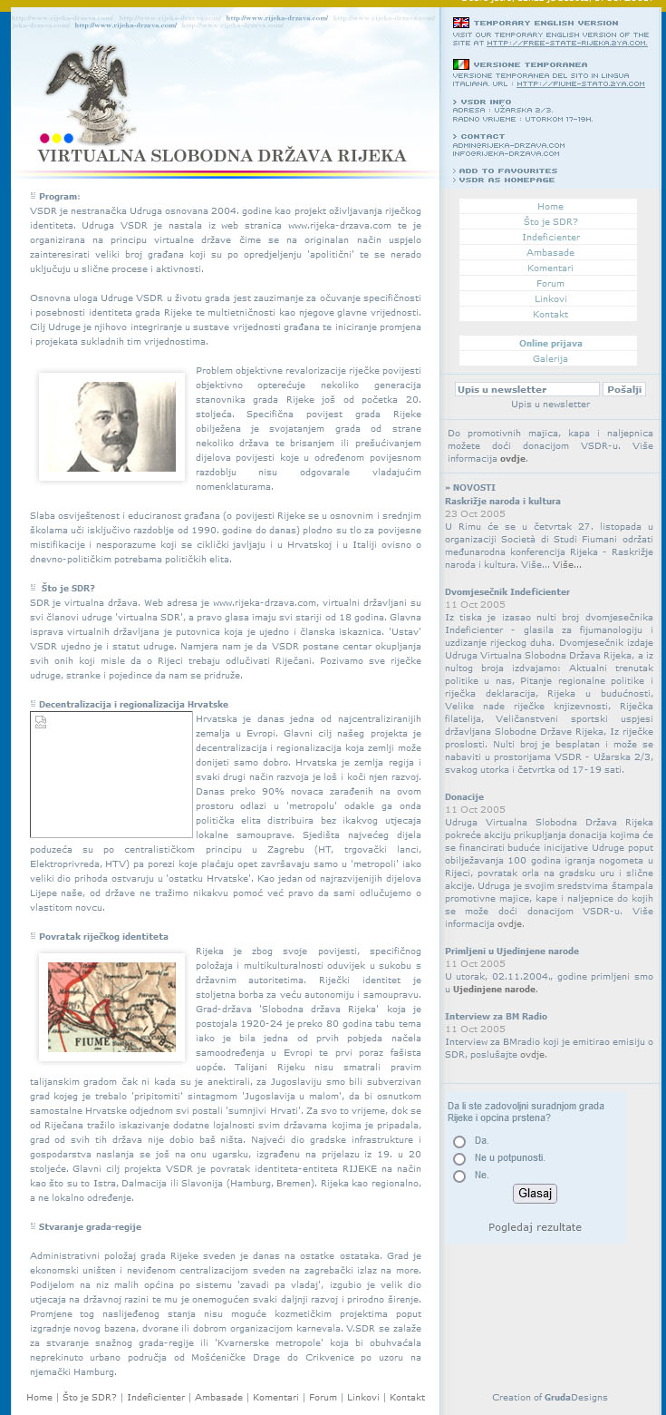 To su bili prvi počeci lokalpatriotizma u našem gradu nakon pada komunističkog totalitarnog sustava. I krenulo se odmah jako!!! Od kultne webstranice SDR koja je i danas remekdjelo (Gruda) a u to vrijeme perverzija, privlačilo je sve više i više ljudi. I prvi put spojilo ljude (Fiumane) koji su morali napustiti grad. Tragovi odlazaka su i dan danas duboki, u tom prilogu govore napušteni stanovi u širem središtu Rijeke, koji podsjećaju da su u njima nekoć živjeli ljudi, čije jezik, kulturu, običaje, vjeru, patnju , ljubav današnji žitelji ne razumiju ili ne žele razumjet. Istina koliko bila bolna i neugodna ne smije se prešućivati i trebat će se kad tad pogledati u ogledalo.. Ne zbog prošlosti nego zbog naše budućnosti.