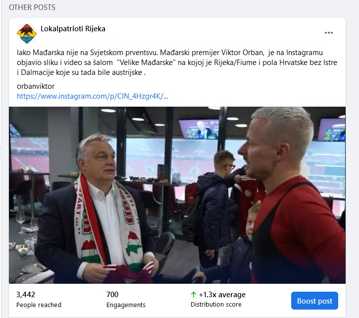 2022. Iako Mađarska nije na Svjetskom prvenstvu. Mađarski premijer Viktor Orban, je na Instagramu objavio sliku i video sa šalom “Velike Mađarske” na kojoj je Rijeka/Fiume i pola Hrvatske bez Istre i Dalmacije koje su tada bile austrijske.