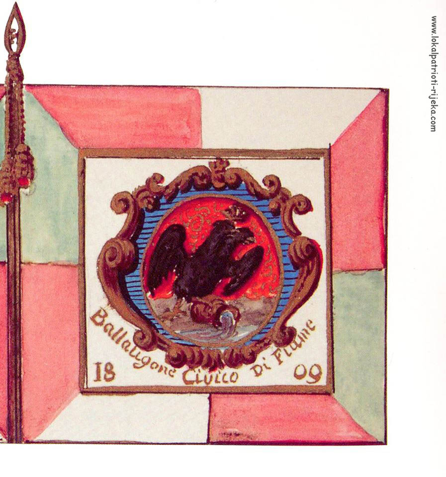 Zastava Riječkog gradskog bataljuna s ugarskim grbom pod krunom svetoga Stjepana s jedne i s druge riječkim dvoglavim orlom. 1809. (Državni arhiv Budimpešta)