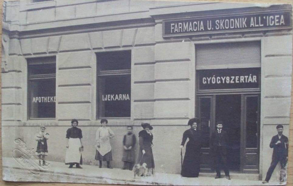 Slavenski jezik je u 19 stoljeću i početkom 20 st., u Rijeci bio samo jedan od jezika koji se koristio. Riječka ljekarna Skodnik u današnjoj Laginjinoj ulici (Chipoteka)