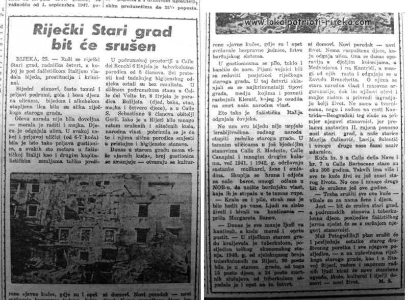 Jest – bit će srušen stari grad a podrumskih stanova i tuberkulozne djece, posljedice fašističkog jarma sjećat će se s mržnjom njegovi stanovnici. Naš petogodišnji plan srušit će i posljednje ostatke starog društvenog poretka i sve njegove posljedice, – a na ruševinama riječkog starog grada, kao i u čitavoj Rijeci, radom i naporom radnih ljudi nicat će nove stambene zgrade, škole, kulturni i dječji domovi – novi život. Autor teksta M.Š