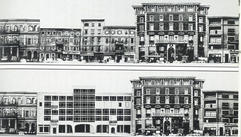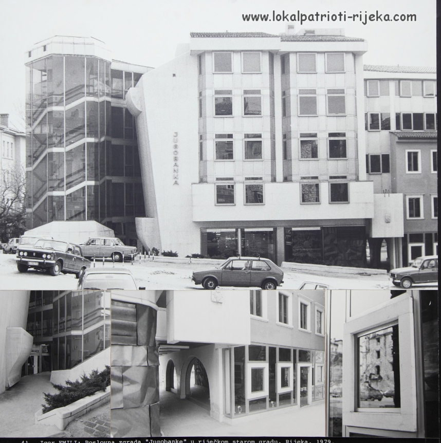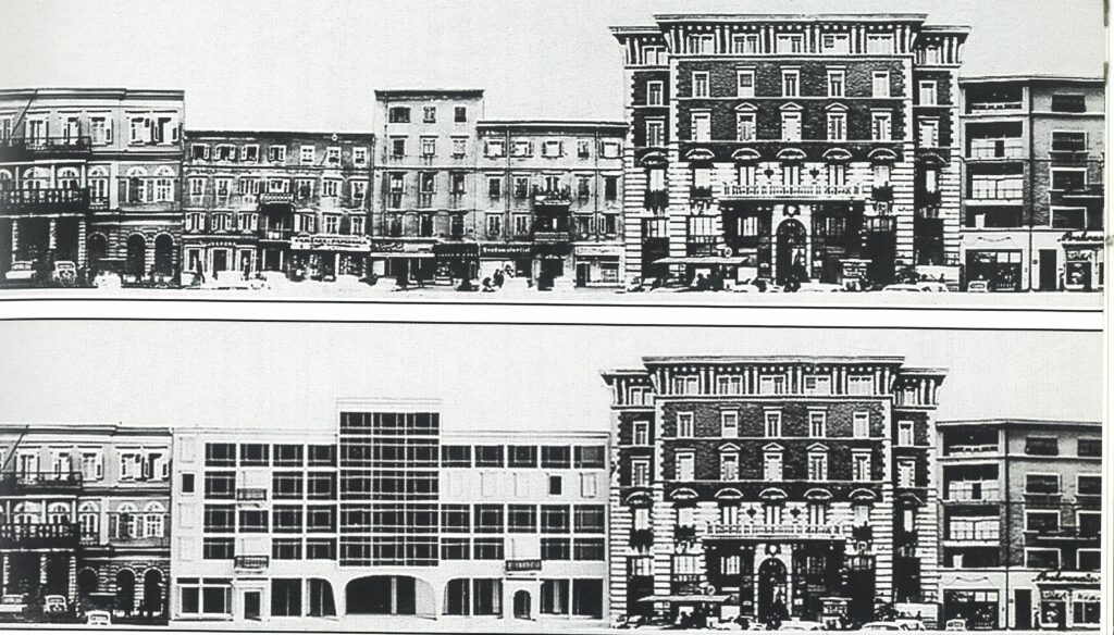 Klasicističke kuće Giomarini, Terzi i Spingaroli na Korzu 22, 20 i 18, na čijem je mjestu trebala biti sagrađena zgrada Skupštine općine Rijeka. Projekt Igora Emilija za zgradu Skupštine općine Rijeka na Korzu (1969.). Srećom projekt nije ostvaren ! Izvor
