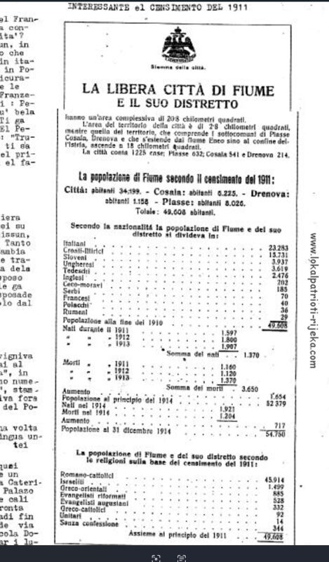 LA LIBERA CITTA DI FIUME – Popis stanovništva 1911. Rijeka je većinski talijanski grad. Nevjerojatan podatak je da nema niti jedne knjige o povijesti grada na hrvatskom jeziku do 1945. Tek poslije 1945. Sve su na talijanskom. Danas je broj Talijana u Rijeci zanemariv. Tek 1 %.