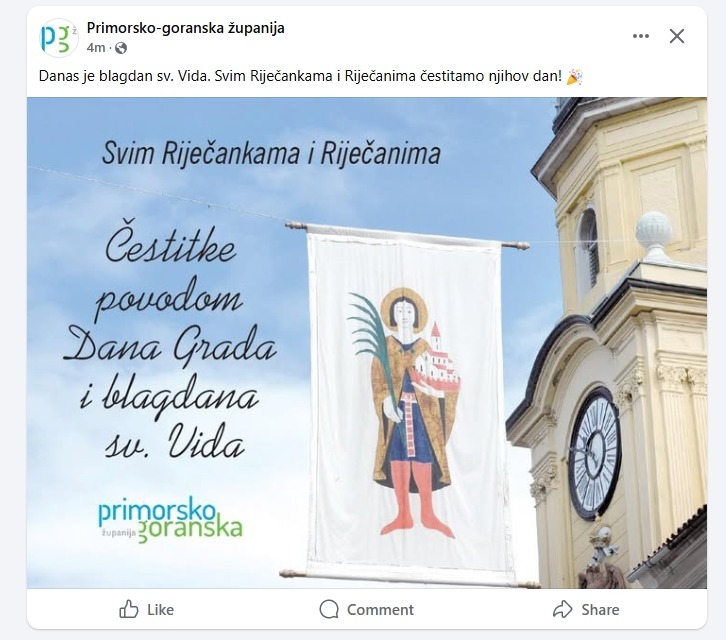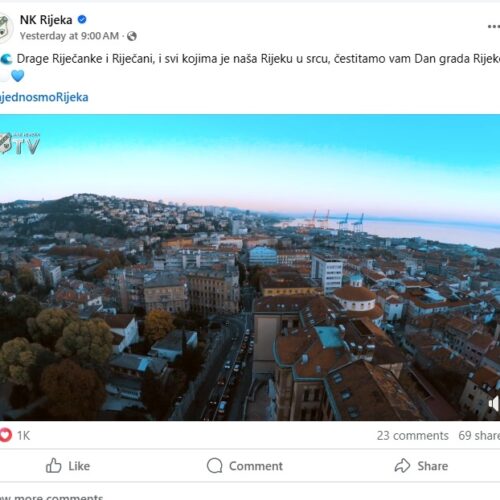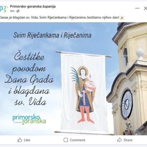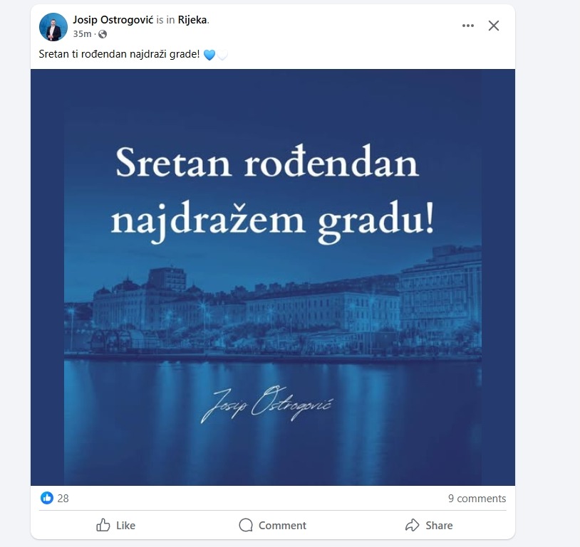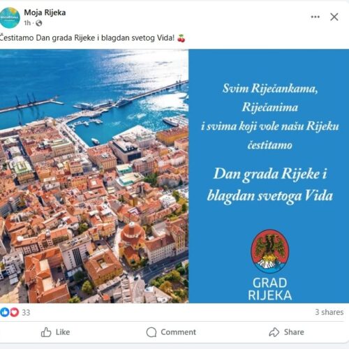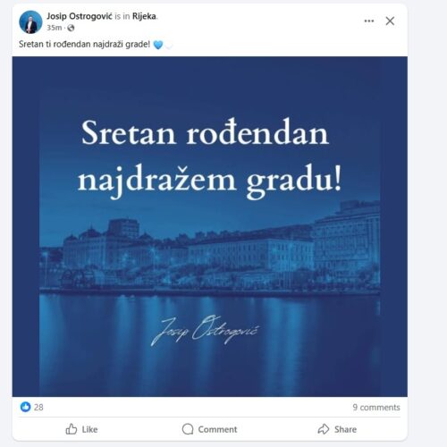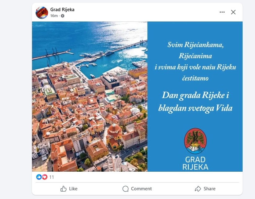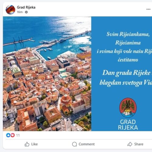 Na balkonu zgrade Grada Rijeke, nova gradska vlast vratila je svečanu riječku trobojnicu koja nije bila postavljena još od dolaska Marka Filipovića (SDP) na vlast. Nažalost na Korzu se vijore samo zastave na svetog Vida dok nema niti jedne zastave grada iako je Dan Grada. Svečane zastave Grada Rijeke uopće nisu izvješene jer su “nestale” pa nova vlast nije imala vremena reagirati. Toliko o brizi riječkog SDP-a o riječkom identitetu koji ga nikad nije zanimao i njihovima ideologijama, koje su samo 35 godina dijelile ljude.