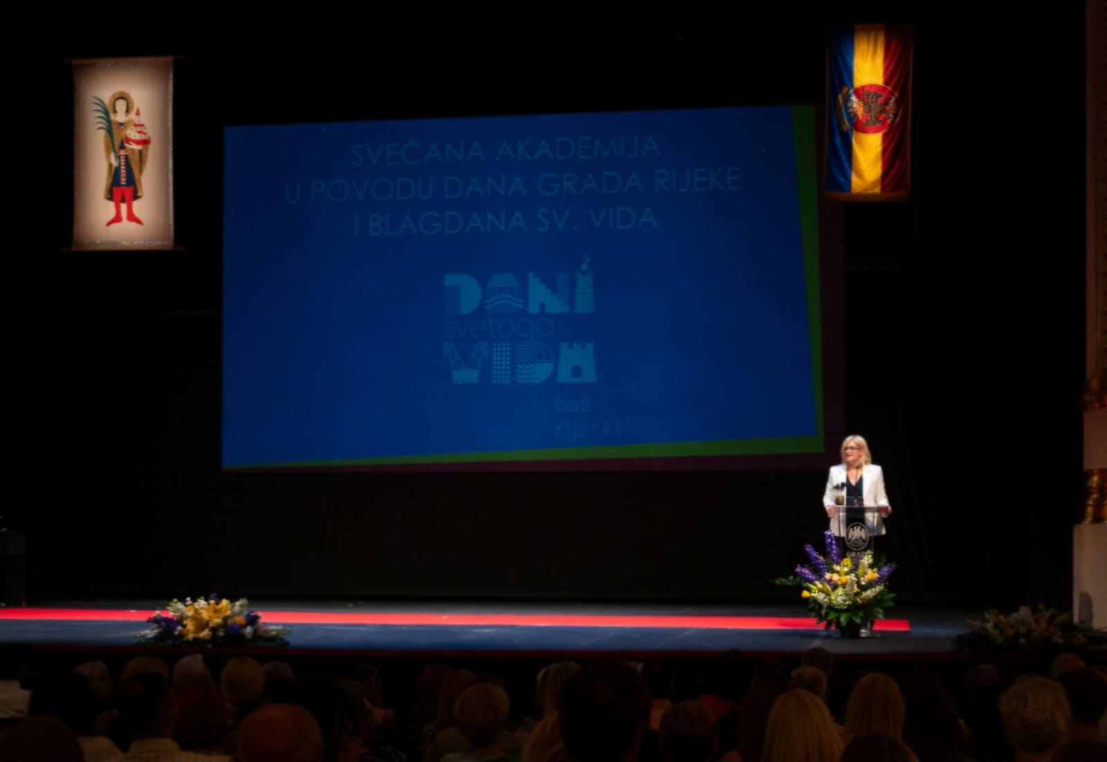Nova gradonačelnica Rijeke Iva Rinčić i riječka svečana gradska zastava. Kazalište , svečana sjednica.