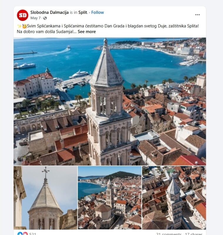 Ovo je primjer kako neki drugi gradovi, svoj dan grada slave. I kako najveća novina u Dalmaciji to radi za razliku od Novog lista. Slobodna Dalmacija čestitala je 07.05. 2025. Dan grada Splita i blagdan svetog Duje.