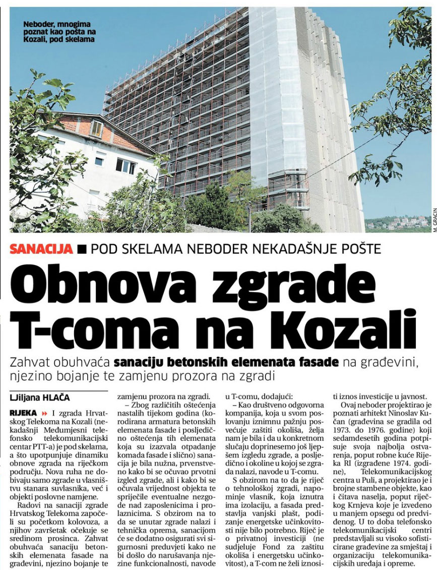 Arhitektonski simbol Rijeke, danas je vidljiv s riječke zaobilaznice – “Međunarodni telegrafski-telefonski centar” neboder na Kozali, Petra Kobeka 15.