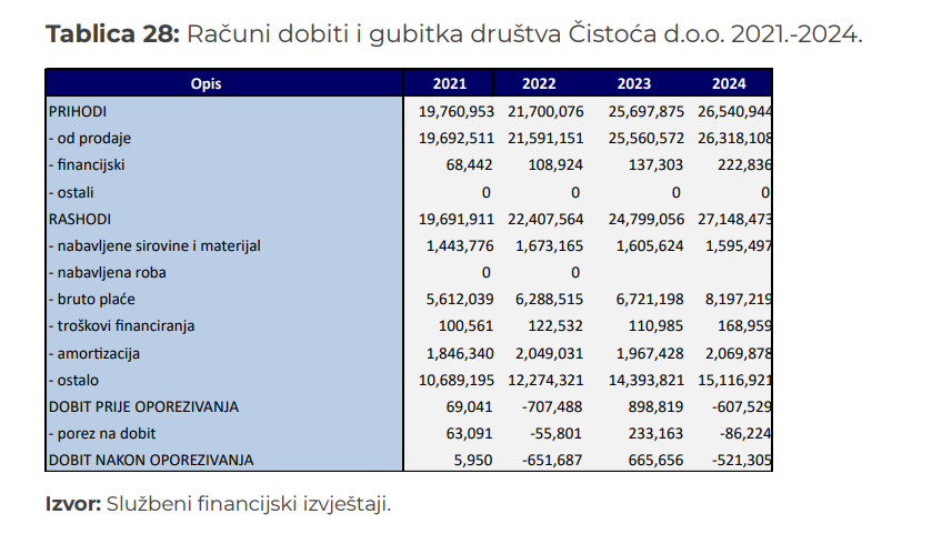 Osim što Čistoća stvara gubitke, dužna je i preko 4 milijuna €. Dugoročne obveze u većini godina nisu pretjerane (oko 1,5–2 milijuna eura), ali 2024. skaču na 4,39 milijuna eura, pri čemu krediti prema financijskim institucijama rastu s 1,37 na 4,33 milijuna eura. To je vrlo jasan znak da je Čistoća ušla u razdoblje pojačanog zaduživanja, vjerojatno radi financiranja investicija u vozila, opremu ili prilagodbu novim zahtjevima gospodarenja otpadom.