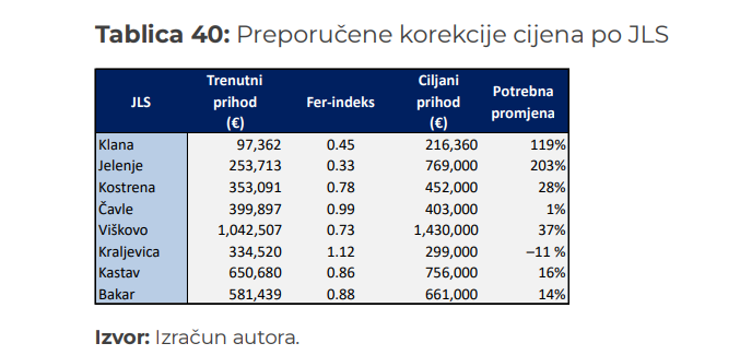 Iz podataka u tablici dade se zaključiti da Jelenje, Klana i Viškovo imaju najveći diskont (premalo plaćaju) i to Jelenje (−67 % u odnosu na fer cijenu), Klana (−55 %) te Viškovo (−27 %). Ove tri JLS sustavno su ispod razine koja bi pokrivala njihove stvarne troškove — osobito kad se uračuna kilometraža i relativno visoki troškovi ruta.