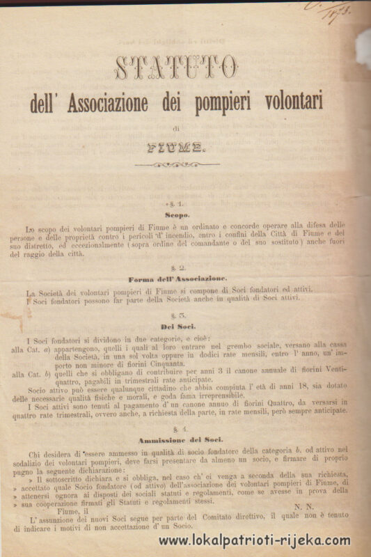 Statut Corpo di Pompieri volontari, statut iz 1873. godine. Riječki magistrat izražava u dopisu ministarskom vijeću svoju potporu građanima, koji su odlučili osnovati jedno vatrogasno društvo na korist svim građanima. Guverner obavještava da je ministar unutrašnjih poslova odobrio riječki statut. Zapovjednik riječkih dobrovoljnih vatrogasaca postaje barun Šimun Vranyczany, riječki patricij rođen u Senju. Izvor : Riječke vatre, 2004.