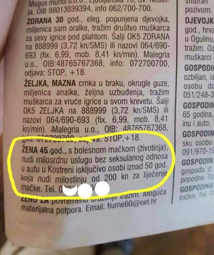 Rubrika “Poznanstva” uvijek se čitala. Seksualni oglasi u Hrvatskoj nalaze se u sivoj zoni, no u kontekstu zakona o prostituciji, njihova je legalnost vrlo upitna jer je odavanje prostituciji i dalje prekršaj.