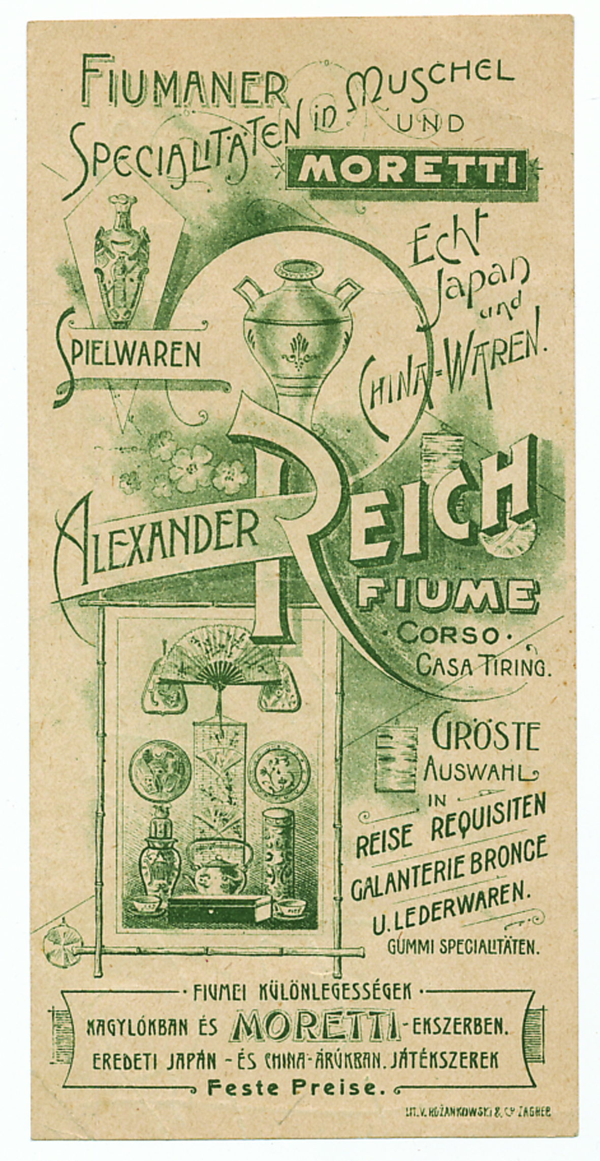 Alexander Reich jedna od reklama za dućan s hranom, igračkama i rekvizitima iz Japana i Kine, oko 1920.