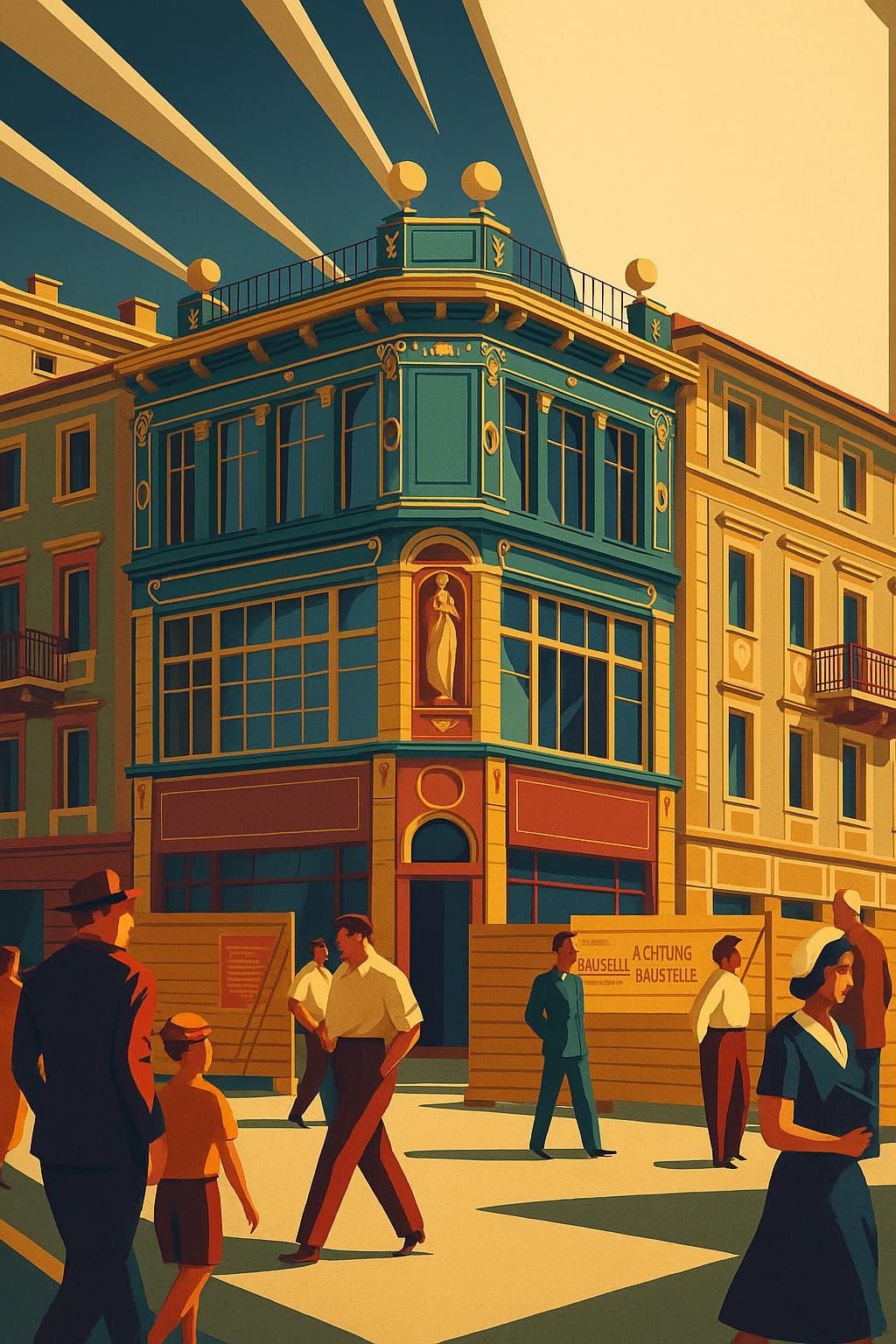 Lijevo skroz Tiring i kuća preko puta su srušene. Uz njih je kuća Schittar iz 1904. koja je preživjela.