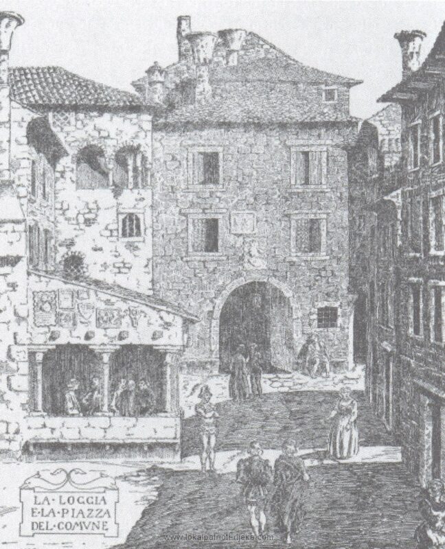 Zanimljivo crtež nije utemeljen na vjerodostojnim povijesnim podacima jer već prema samoj vijećnici, koja je prikazana u visini dva kata, a vidjet ćemo da je drugi izgrađen tek u prvoj polovini 18. stoljeća. Izvor slike: Riccardo Gigante, prikaz gradske vijećnice i lože na imaginarnom crtežu Koblerova trga u 16. st., objavljen u radu Silvina Gigantea Fiume nel Quattrocento (1913.).