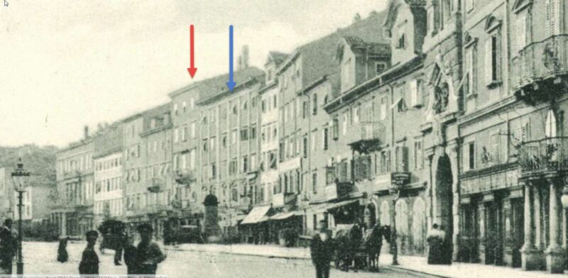Nisu samo ove dvije zgrade stradale , još je tu bilo rušenja. No crvena i plava strelica bila bi lokacija današnjeg poglavarstva.