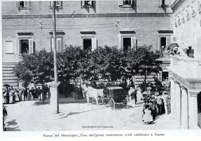 Stendarac stup za zastavu ispred Municipija. Na slici civilno vjenčanje. Zanimljiva je činjenica o riječkoj borbi za autonomiju 1848. , kada su se Riječani i pripadnici te političke struje željeli lukavo izbjeći priklanjanje bilo kojoj državnosti, i onoj ugarskoj i onoj hrvatskoj, pa su umjesto vješanja njihovih trobojnica na stendardac, izradili vlastitu od boja gradskoga grba karmin crvene, zlatno žute i ultramarin plave.